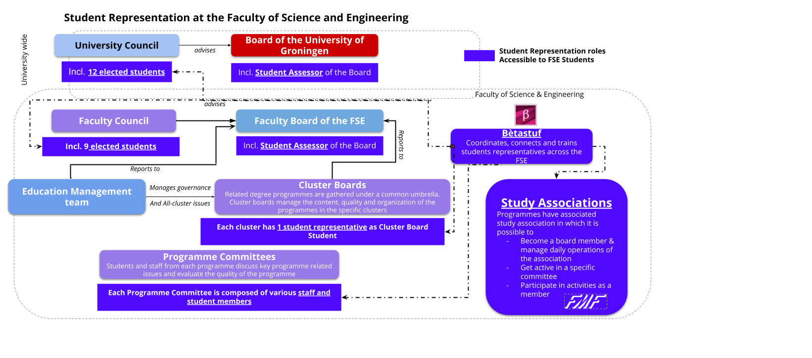 The University of Groningen has an extensive system of consultative participation for students. Consultative participation is linked to three levels of management bodies. Each level has a board or a director, and each board or director consults with a consultative body. Consultative participation at the University of Groningen is based on the principle of joint consultation, which means that both students and staff are represented in the same consultative body and that both groups together consult with the relevant board. A well organized participation body is of great importance for the functioning of the university and contributes in guaranteeing the quality of education. A survey of all different consultative bodies is given below, and is visually laid out in the following diagram: